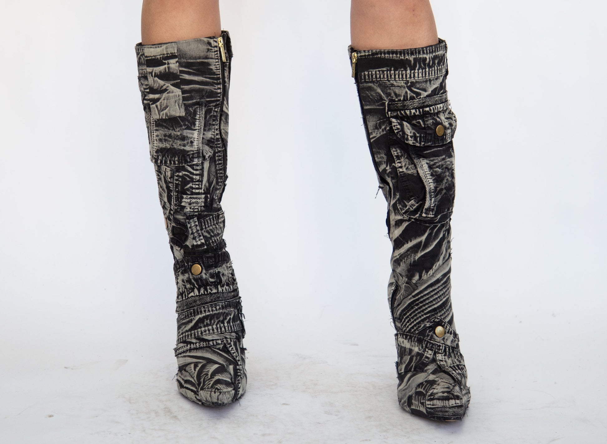 Step into refined elegance with these size 8 below-the-knee boots, crafted from grey acid wash denim for a distinctive look. Featuring a sleek stiletto heel, they bring a bold yet sophisticated edge to any outfit. Previously worn only for editorial shoots, these boots combine style with exclusivity, perfect for making a lasting impression.