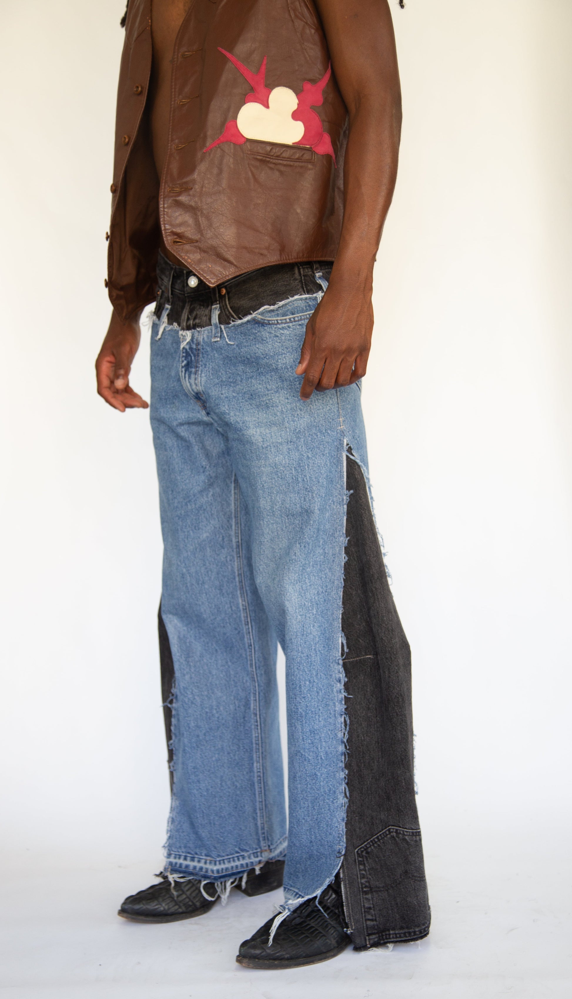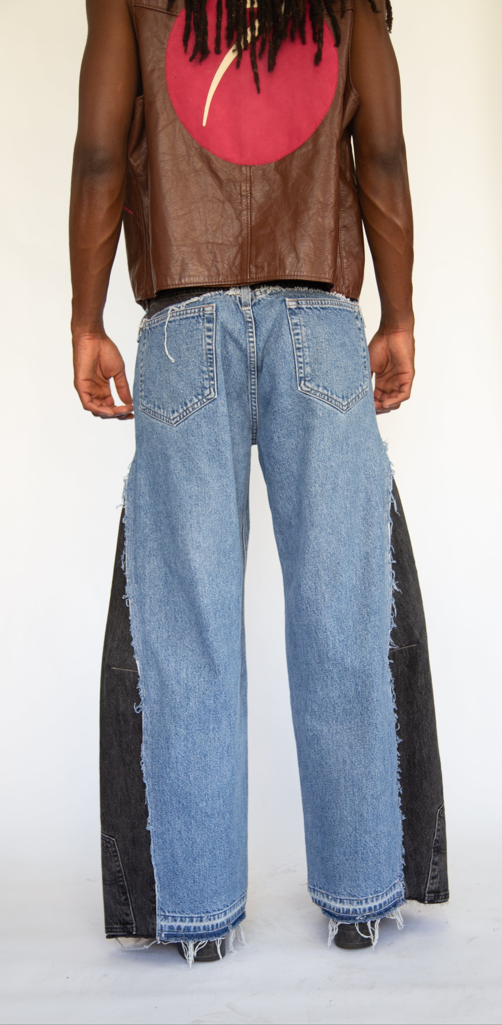 These wide-leg upworked denim jeans blend medium and dark washes for a unique, sophisticated look. Featuring raw seams and edges, they offer a modern, effortlessly stylish silhouette. With a 31" waist and 42.5" outer seam, these jeans combine comfort and statement design, perfect for elevating your everyday wardrobe.